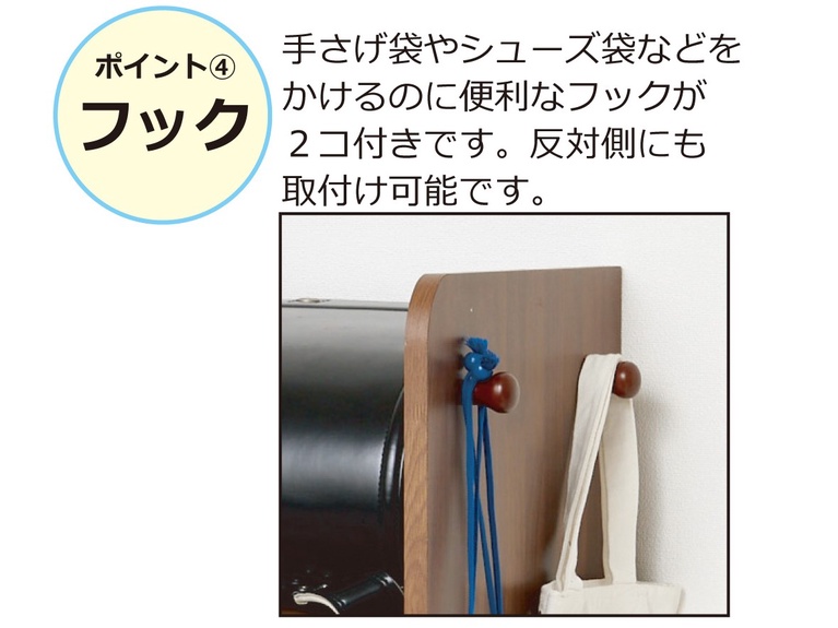 手さげ袋やシューズ袋などをかけるのみ便利なフックが2個付きです。
