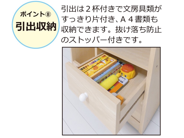 引出しは2杯付きで文房具類がすっきり片付き、A4書類も収納できます。