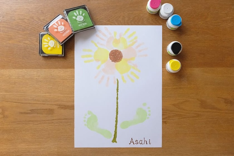 粘土みたいな不思議なえのぐを使ってつくる、ちょっと立体感のあるアートポスター。こどもの手形と足形で完成させるひまわりアートとこどもの名前の他にはあえて一切の装飾を加えないことで、よりシンプルでアートっぽい雰囲気のあるポスターに仕上げました。