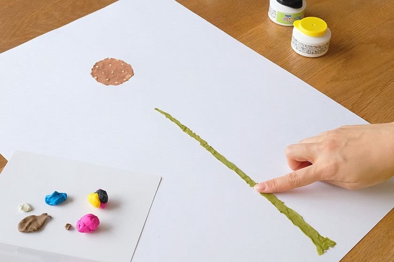 3.茶色まるの上に、白色の小さなまるを散らし、緑色の線を引き、ペタペタおえかきが紙に定着して固くなるまで乾かす。