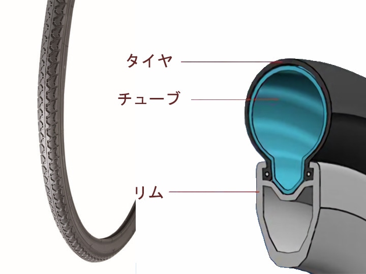 自転車を使用する上で、消耗品の筆頭はタイヤとチューブです。タイヤは外側から見える黒いゴムの部分で、中にチューブが入っています。タイヤのゴムがツルツルに減っていたり、またひび割れが発生したりしていると、本来の性能を発揮しないことはもちろん、とても危険です。