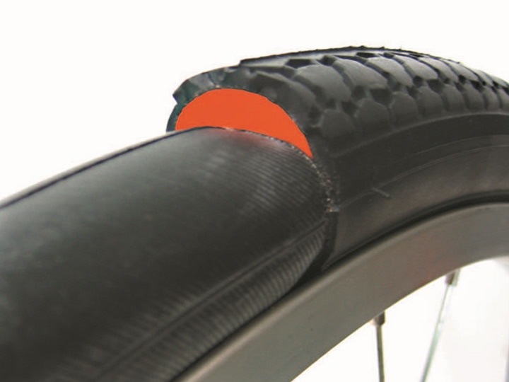 パンクしにくいタイヤは通常のタイヤより分厚く作られているのが特長です。厚いので釘などが刺さっても、チューブまで届きにくく、パンクが起きにくい構造になっています。