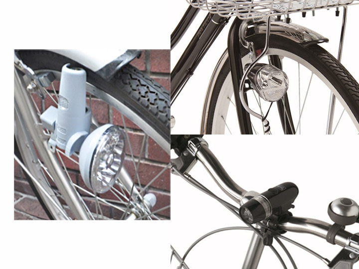 ③ ハンドルに取り付けて使用する「電池式ライト」。近年では省エネのLEDライトが主流です。