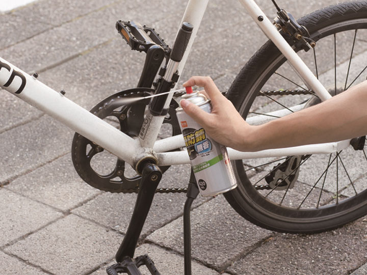 錆がある場合、防錆潤滑剤をスプレーして、錆を取り除きましょう。余分な潤滑剤はウェスなどでふき取ります。