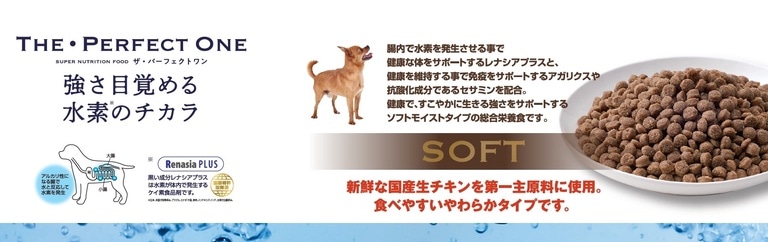 腸内で水素を発生させる事で健康な体をサポートするレナシアプラスと、<br>健康を維持する事で免疫をサポートするアガリクスや抗酸化成分であるセサミンを配合。<br>健康で、すこやかに生きる強さをサポートするソフトモイストタイプの総合栄養食です。<br>国産チキンを第一主原料に使用。おいしく食べて健康をサポートします。<br><br>大阪大学の国際特許である体内(腸)で水素を発生させるケイ素食品剤を犬フードに添加することで、健康と生きる強さをサポートできるフードを開発できないかと考え開発しました。