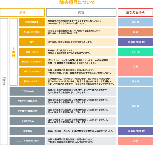 医療分野で活躍する東レのハイテク素材、中空糸フィルターが多層構造を形成。ミネラル分は損なわずに、にごり、鉄サビ、一般細菌、大腸菌、原虫類などミクロの汚れをキャッチするので、毎日、美味しくて安全な水を使うことができます。
