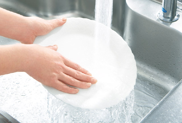 原水シャワーの穴を従来品より小さくすることでシャワーの強さを維持しており、お皿洗いも快適です。
