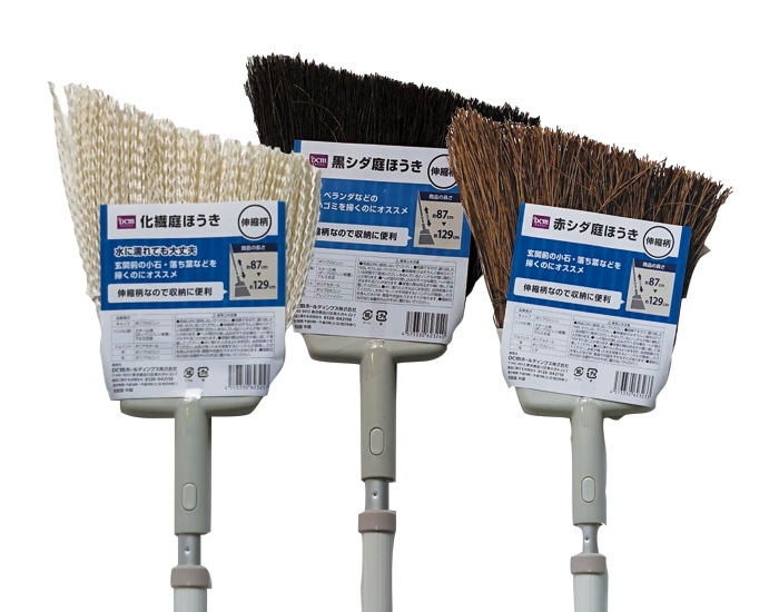 DCMブランドの「庭ほうき 伸縮柄」各種は、狭い場所で細かく掃きたい時、広い場所でたくさんのものを掃きたい時などや、階段などの段差のある場所での掃き掃除など、用途に合わせて柄の長さを調節していただくことで、掃除場所に応じて楽な姿勢で掃除お使いいただけます。