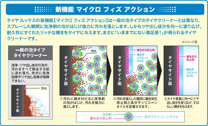 マイクロ フィズ アクション<微小発泡作用>が汚れを分解し浮き上がらせ、キレイに洗浄しながらツヤ出し成分をタイヤ表面に均一に付着させ、艶やかな光沢被膜を形成します。