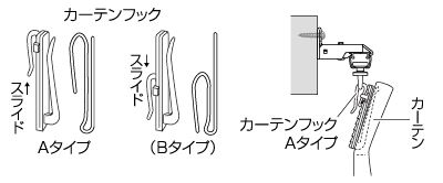 カーテンを吊るす際、カーテンフックのAタイプ(画像参照)を使用されますとカーテンの吊りもとがよりう美しくなり、ランナーの走行がスムーズになります。