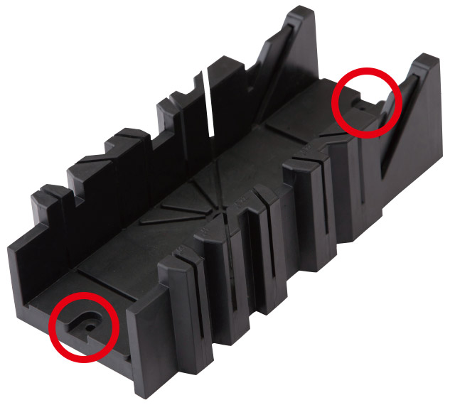 鋸ガイドの両サイドにはビスが入る穴があり、作業台にビスで鋸ガイドを固定することができます。