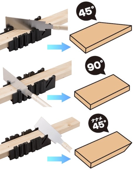 鋸ガイドに木材をセットし、両サイドの溝に鋸を合わせて挽くことで、45°、90°、斜め45°の3種類に真っすぐ切断できます。