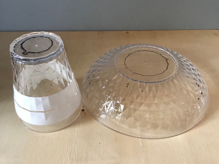 コップ、お皿の両方の底面にカットする場所を下書きし、電動ドリルで穴を開けます。