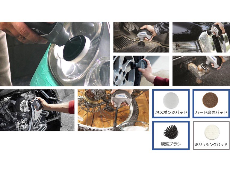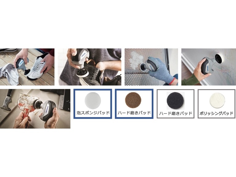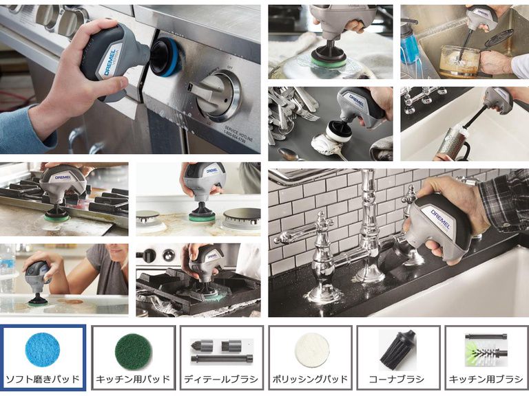 アクセサリーを替えることにより、ガラス、金属、布、プラスチックなど様々な汚れを落とすことができます。