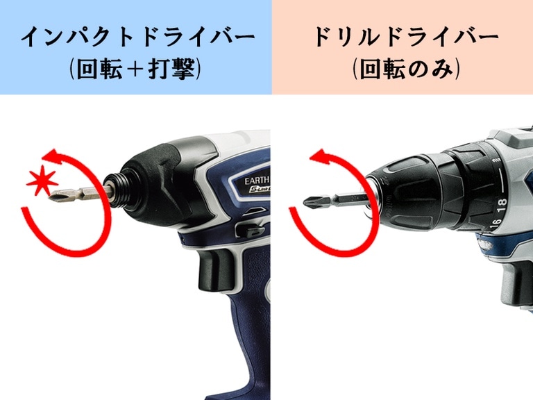 一番の大きな違いは、インパクトドライバーは回転とともに打撃が加わることです。