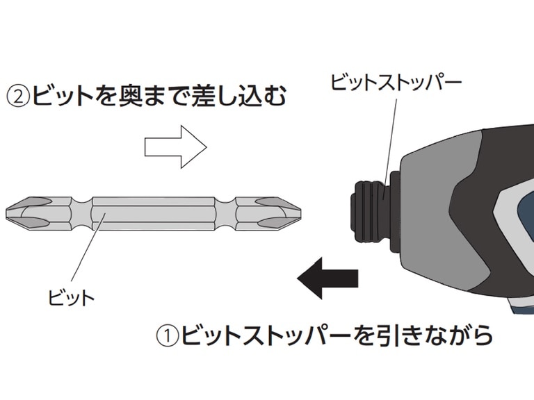 インパクトドライバーはビットストッパー(スリーブ)を手前に引きながら、ビットを差し込むだけでのワンタッチで取付けができます。