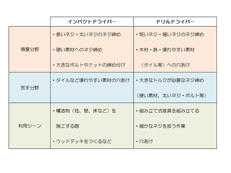 「インパクトドライバー」と「ドリスドライバー」があり、どちらもネジ締めや穴あけができますがただ形や値段が違うだけではありません。