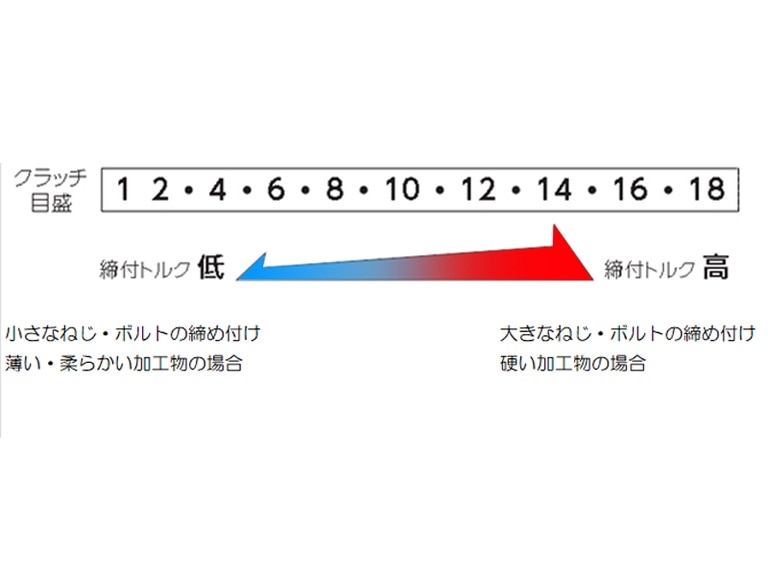 クラッチ機能(締め付ける強さを調整できる機能)が搭載されているので、ネジの締め付け作業時に軟らかい素材や割れやすい場所でも、材料を破損させずにビスを締めつけることが出来ます。