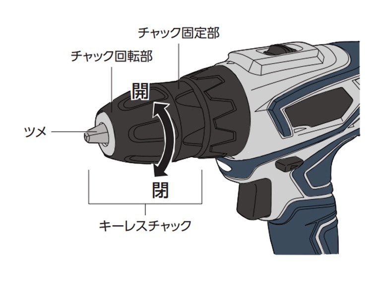 ドリルドライバーはチャック固定部をしっかり握り、チャック回転部を 矢印の「開」の方向に回して、チャックのツメを開きビットを差し込んで取付けます。少し作業が大変ですが、六角軸・丸軸やいろんな径(太さ)の先端工具に対応しています。
