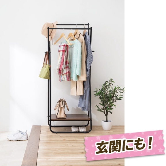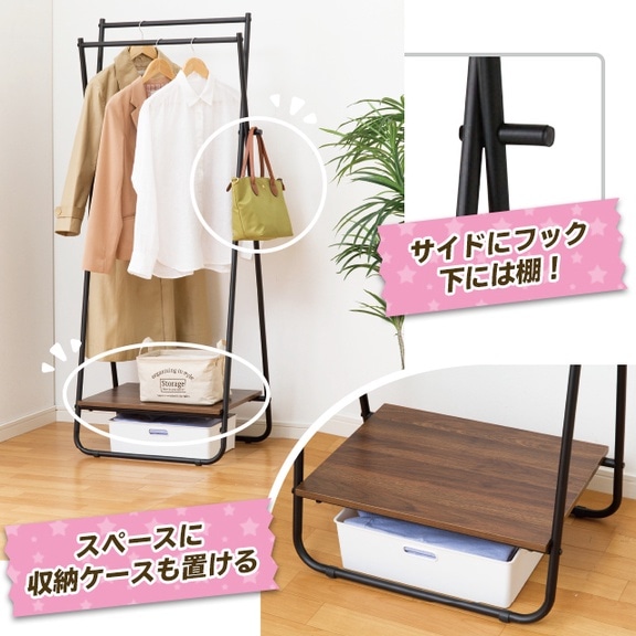 ハンガーラックのサイドにはフック、下には棚を設置。衣類以外にもカバンや帽子を掛けられる。
