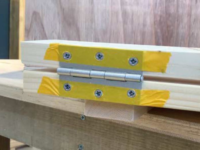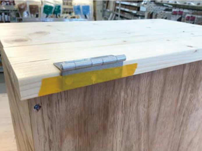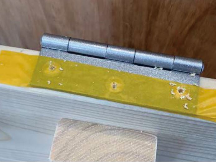 フタの後ろ側に蝶番をマスキングテープで固定します。