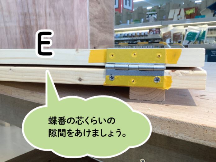 細長い木Eにもマスキングテープでもう半分の蝶番を貼って固定します。