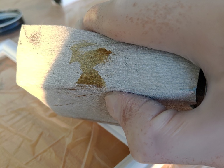 ⑤メラミンスポンジに上塗りする塗料を少量とり、叩くように塗装します。角ばった部分を塗装することでアンティーク感が増します。