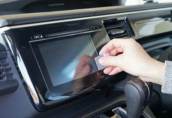 タッチパネルや光沢 樹脂パーツに白く残りがちな化粧品汚れも、コーティングをする事で除去性が向上。