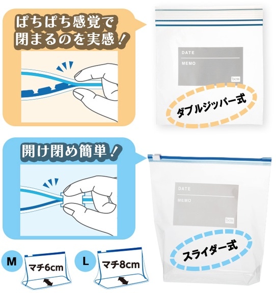 「DCM フリーザーバッグ」には、ダブルジッパー式とスライダー式の2種類があり、使用用途に合わせてお選びいただけます。