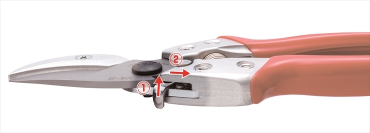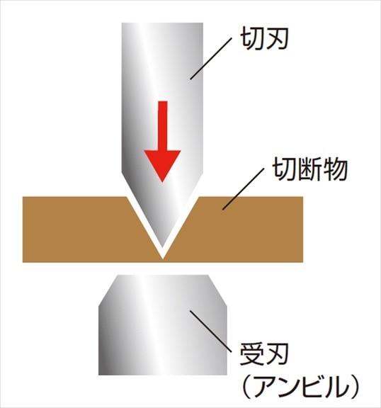 ①アンビルの刃は包丁とまな板の様な役割を果たします。通常の剪定鋏より切り刃が薄く、切断時の抵抗が少ないため、太い枝を楽に切断できます。