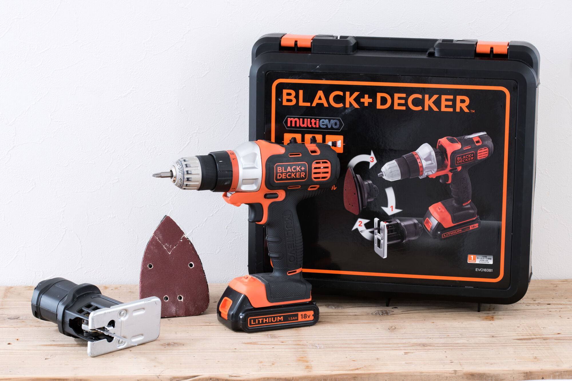 まず、ご紹介する最愛アイテムは、「ブラックアンドデッカー 18v リチウム マルチツールベーシック EVO183B1」。ドリルドライバーとサンダー、ジグソーのヘッドがセットになっており、ヘッドを取り替えれば、1台で3役こなしてくれます。
