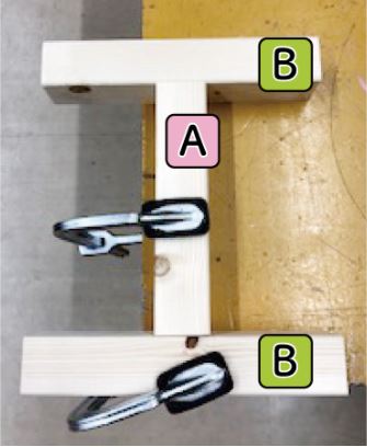 背板は端材を挟むことで位置を調整します。クランプで固定します。