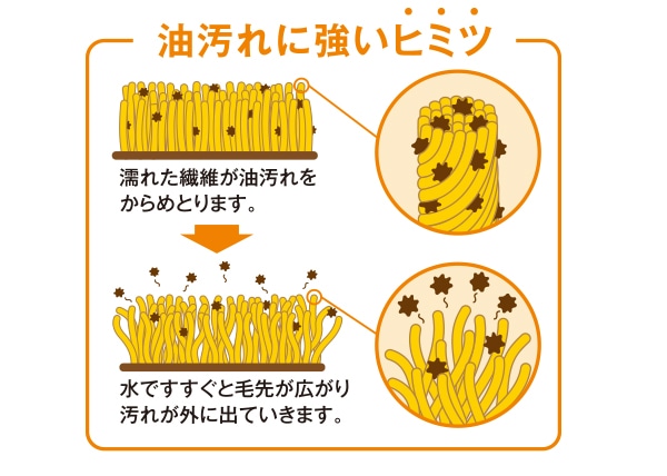 ぞうきんを水に濡らすと、繊維がまとまることで、油汚れをサッと絡めとることができます。使用後、水洗いすると毛先が広がり、油汚れがほぐれるように、ぞうきんから離れていきます。水だけでキレイになり、乾かすことで何度でも使えます。