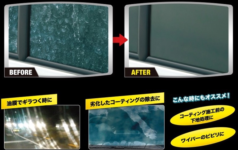 ・油膜による夜間・雨天時の視界不良やワイパーのビビリを改善します。