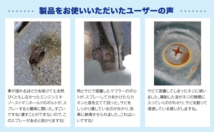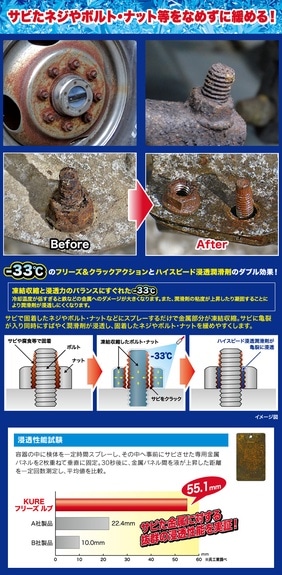 ・凍結収縮してサビを割るフリーズ&クラックアクションとハイスピード浸透潤滑剤のダブル効果により、
