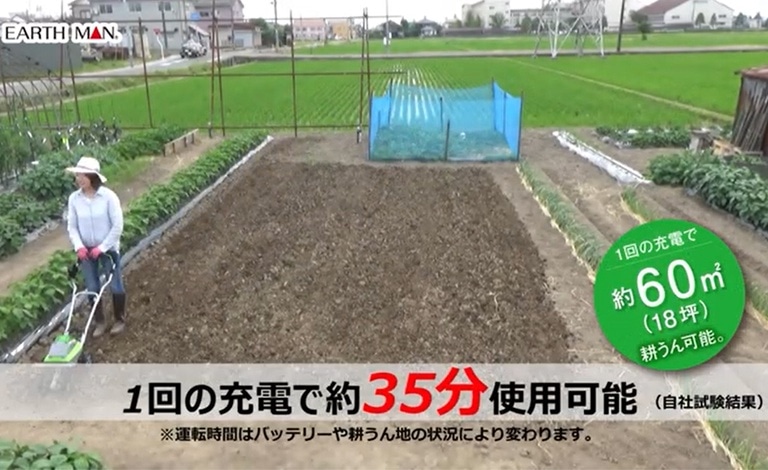 電源の無い所でも使える充電式の耕うん機です。