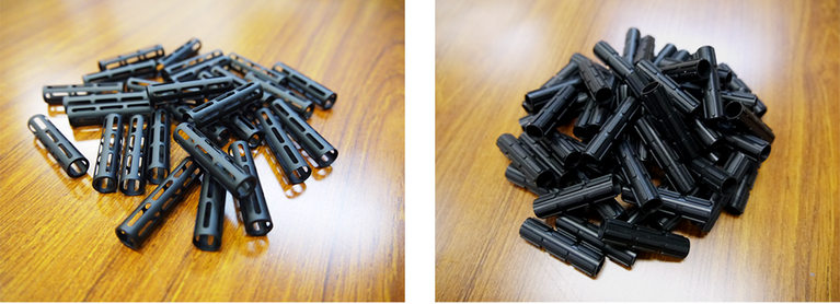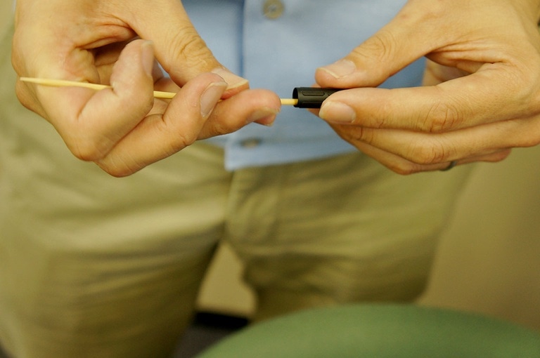試しに私もやらせていただいたが、これがかなり難しい。ラバーを半分に折りたたんだ状態で金属グリップの中に入れる。そして、細い棒を使ってメタルの穴からひとつひとつのラバーをキッチリと出していく。これがなかなかうまくいかない。5分くらい格闘したが、私にはできなかった。熟練の方だと、さっと組み立ててしまうという。