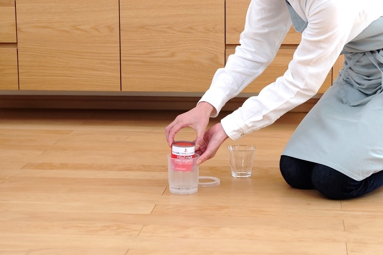 (3)水を入れたプラスチック容器を部屋の中央に置き、赤いシール面を上にして缶を水につけ、リング状の蓋をしてください。約1分で蒸散がはじまります。