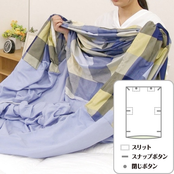 腕を通せるスリットが4ヶ所と、ふとんを固定するスナップボタンが6ヶ所付いています。