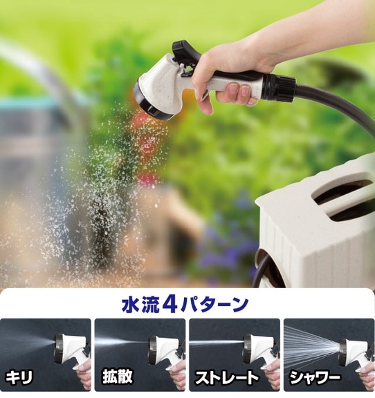 散水ノズルの水流パターンは4種類(キリ・拡散・ストレート・シャワー)で、植物への水やりはもちろん、園芸用品のお掃除や洗車など様々なシーンでご使用いただけます。