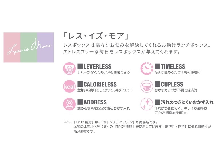 【週末の作り置き】で忙しい朝、お弁当が30秒でつくれちゃう!お弁当箱【レスボックス】です。<br><br>冷凍保存でき驚異の汚れ落ちを実現した専用おかず入れ付き!