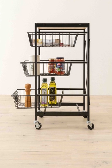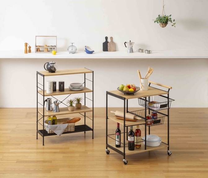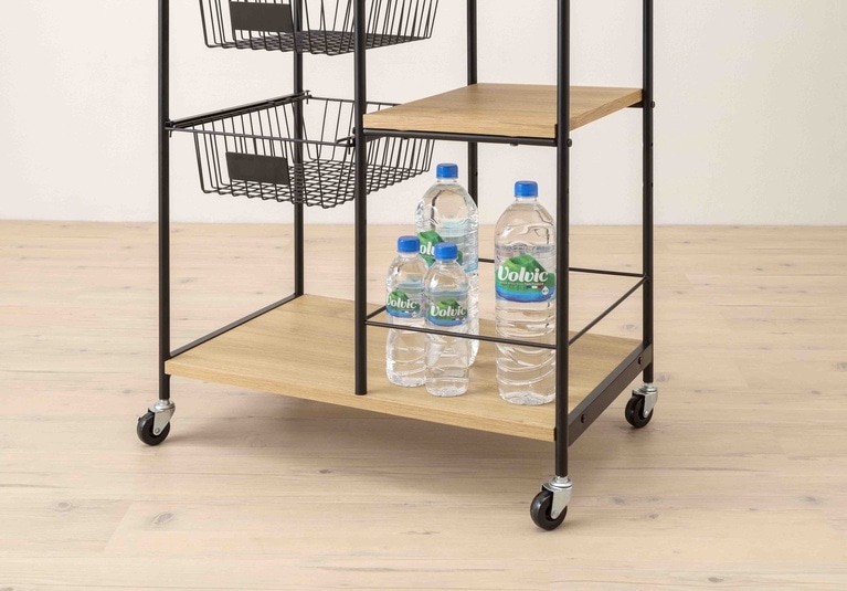 キッチンワゴンはペットボトルの横倒れを防ぐ、安心のバー付き収納スペースを設計しました。