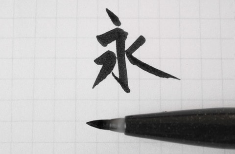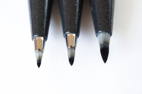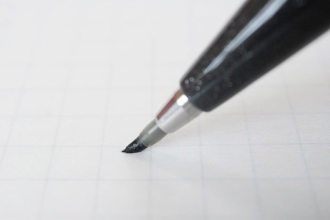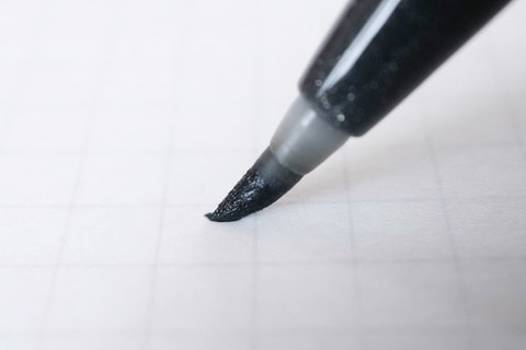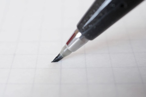 このペンがとても扱いやすいのはサインペンスタイルというのがまずある。さらに注目すべきはペン先の短さだ。筆ペンというと、ペン先が結構長いものが多い。