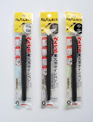 ぺんてる「筆文字サインペン」極細、細字、中字 各150円+消費税。