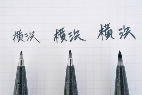 従来から発売されていた「筆文字サインペン」は、細字。それに加えて今回、極細と中字がラインナップされた。