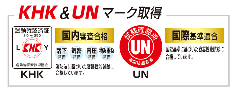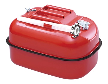 丈夫な金属製のノズル取り付け金具、丈夫な鋼板厚0.8mm、KHK&UNマーク取得、給油時に注ぎやすいように底面形状を工夫しました。