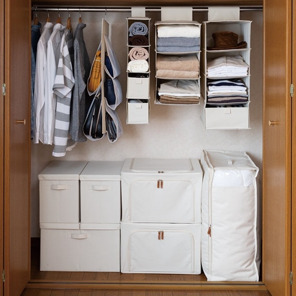 クローゼットボックスは、大サイズと小サイズを重ねて置くことで無駄なくクローゼットに収めることができます。