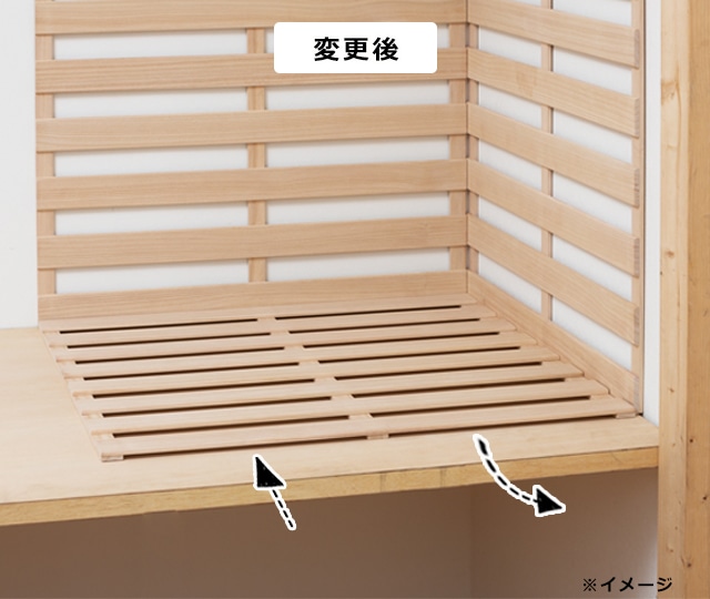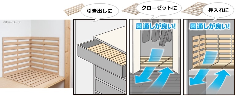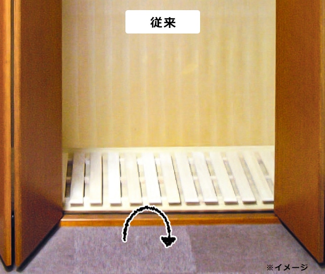 従来は前面と並行方向にある下駄を縦方向に仕様変更することで、すのこを設置するとき、前面から入る空気の流れ道を確保。クローゼットや押し入れの風通しをより良くしてくれます。