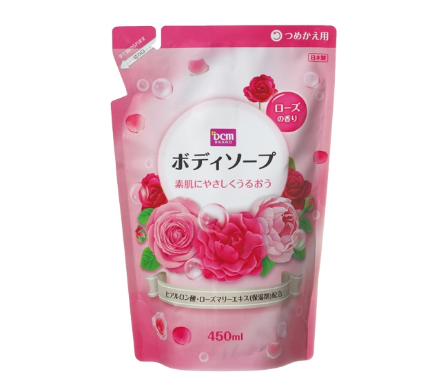 DCMブランド ボディソープ ローズの香り つめかえ用です。ヒアルロン酸、ももの葉エキス(保湿剤)配合の素肌にやさしい全身洗浄剤です。ゆたかでマイルドな泡が汚れをきれいに落とし、全身をすっきり洗い上げます。毎日の入浴や、スポーツ後のシャワーにオススメ!
