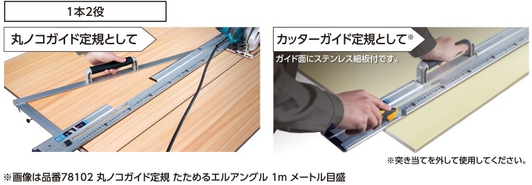 1本で丸ノコガイド定規としてもカッターガイド定規としても使用できます。